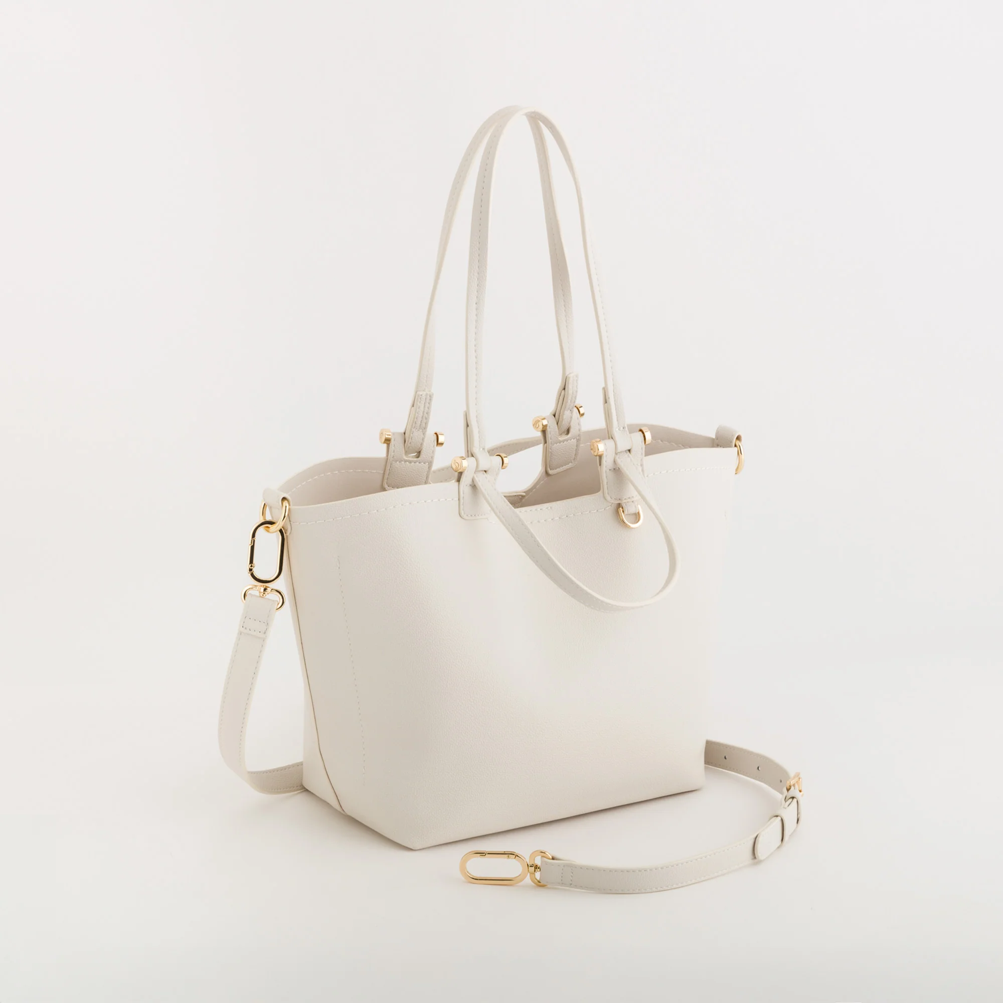 la borsa è sfoderata con scomparto interno chiuso con zip ed è dotata di tasche interne, manici di due dimensioni, tracolla regolabile e removibile e anellino per aggiungere qualsiasi bag charm della collezione e personalizzare la propria borsa.